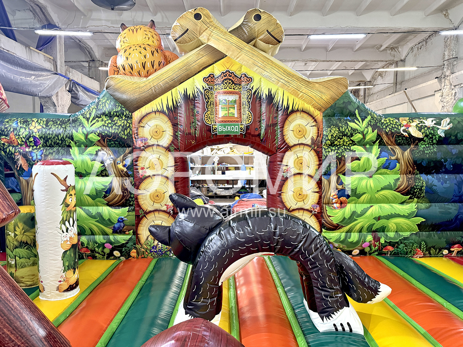 Батут Изба Бабы Яги выполнен по мотивам русских народных сказок во главе с колоритной фигурой самой Бабы Яги. Дети попадая на батут оказываются в настоящей сказке, где можно поиграть в волшебной ступе, прокатиться на гусях-лебедях, попрыгать на метле яги, пробраться под черным котом и побегать в препятствиях-столбцах.