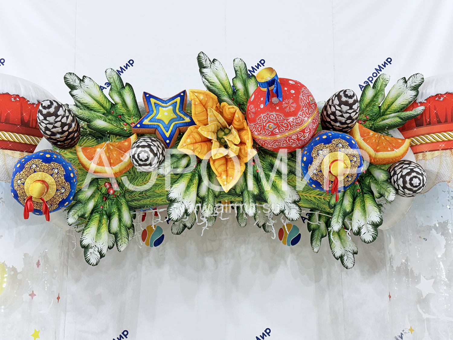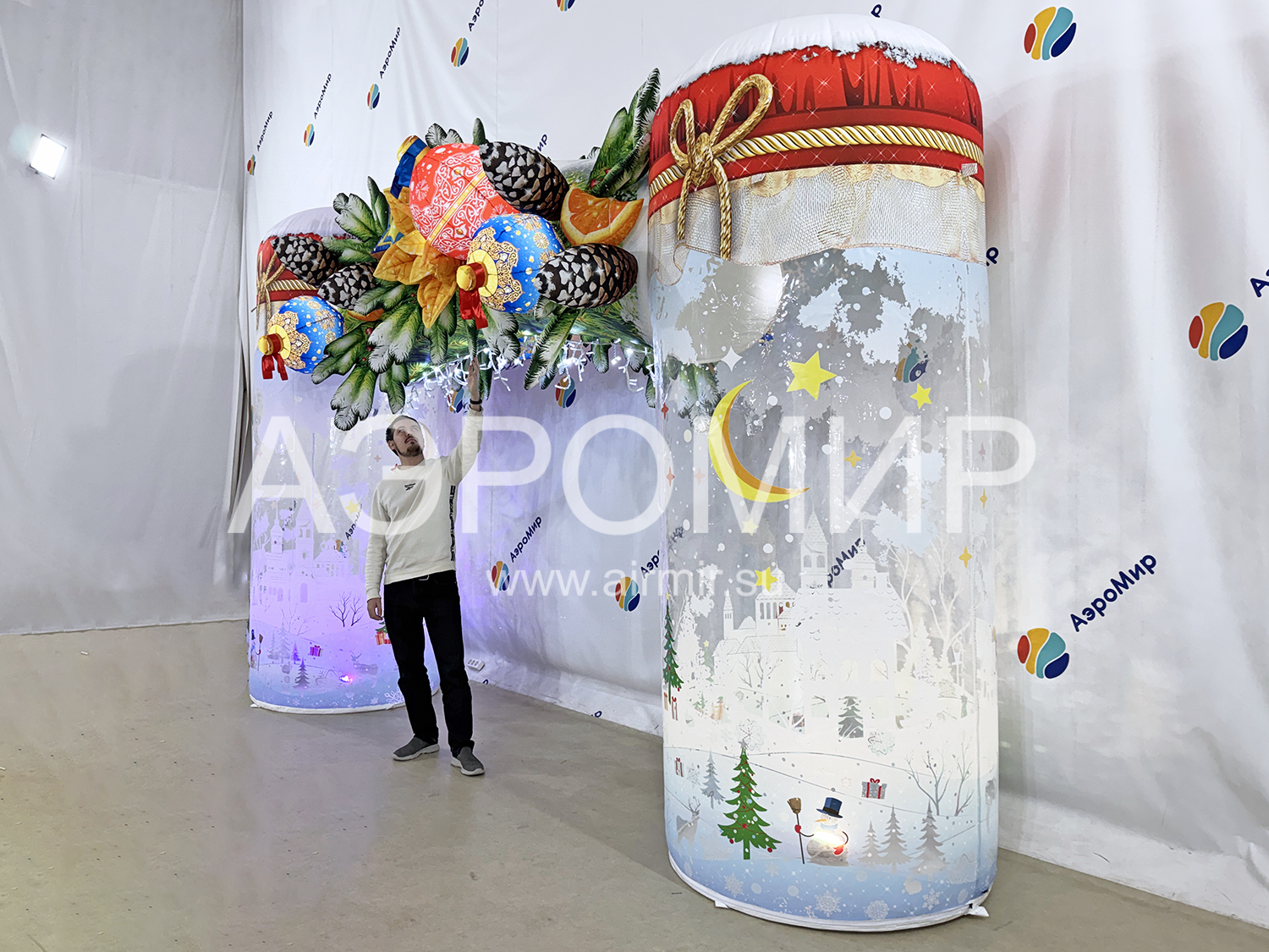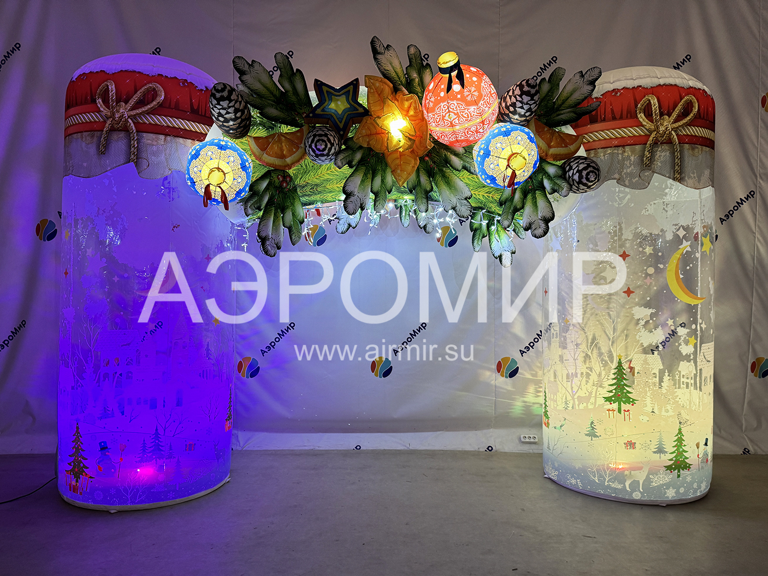Необыкновенно красивая зимняя арка для оформления новогодних и рождественских праздников. Большие размеры, полноцветная фотопечать и подсветка, детальная проработка объемных фигур. По бокам колонны в виде нарядных подсвечников, которые соединяются новогодней гирляндой с елочными шариками, веточками и цветом мандарина. Быстрое изготовление доставка в любую точку. Гарантия производителя 1 год.