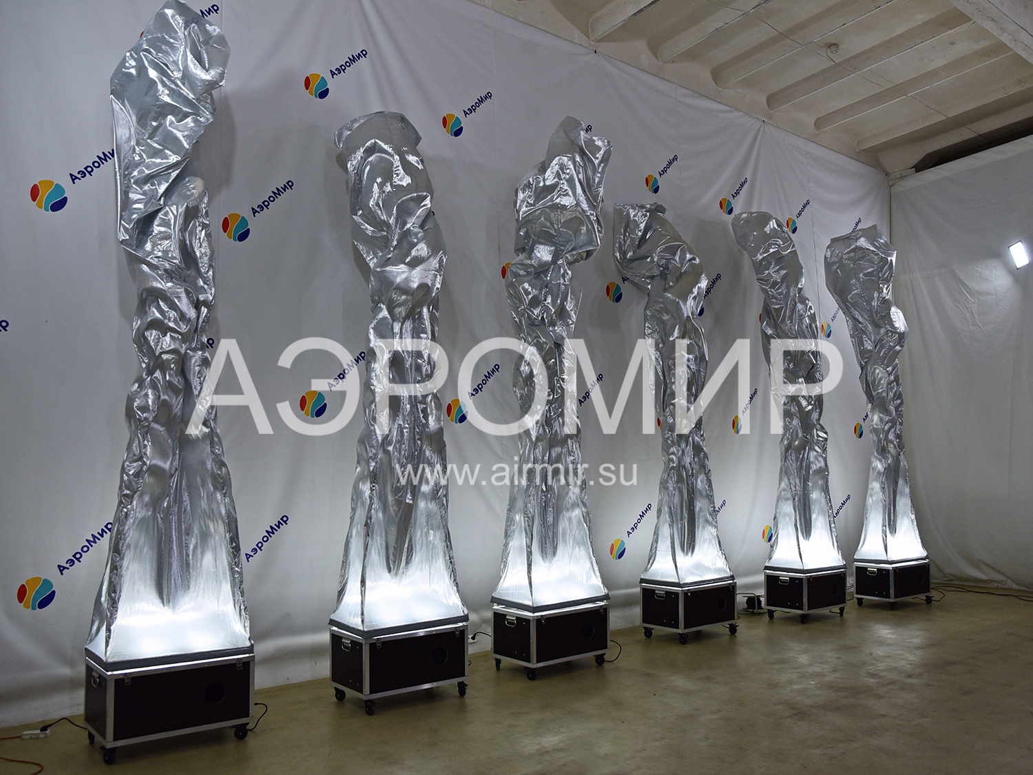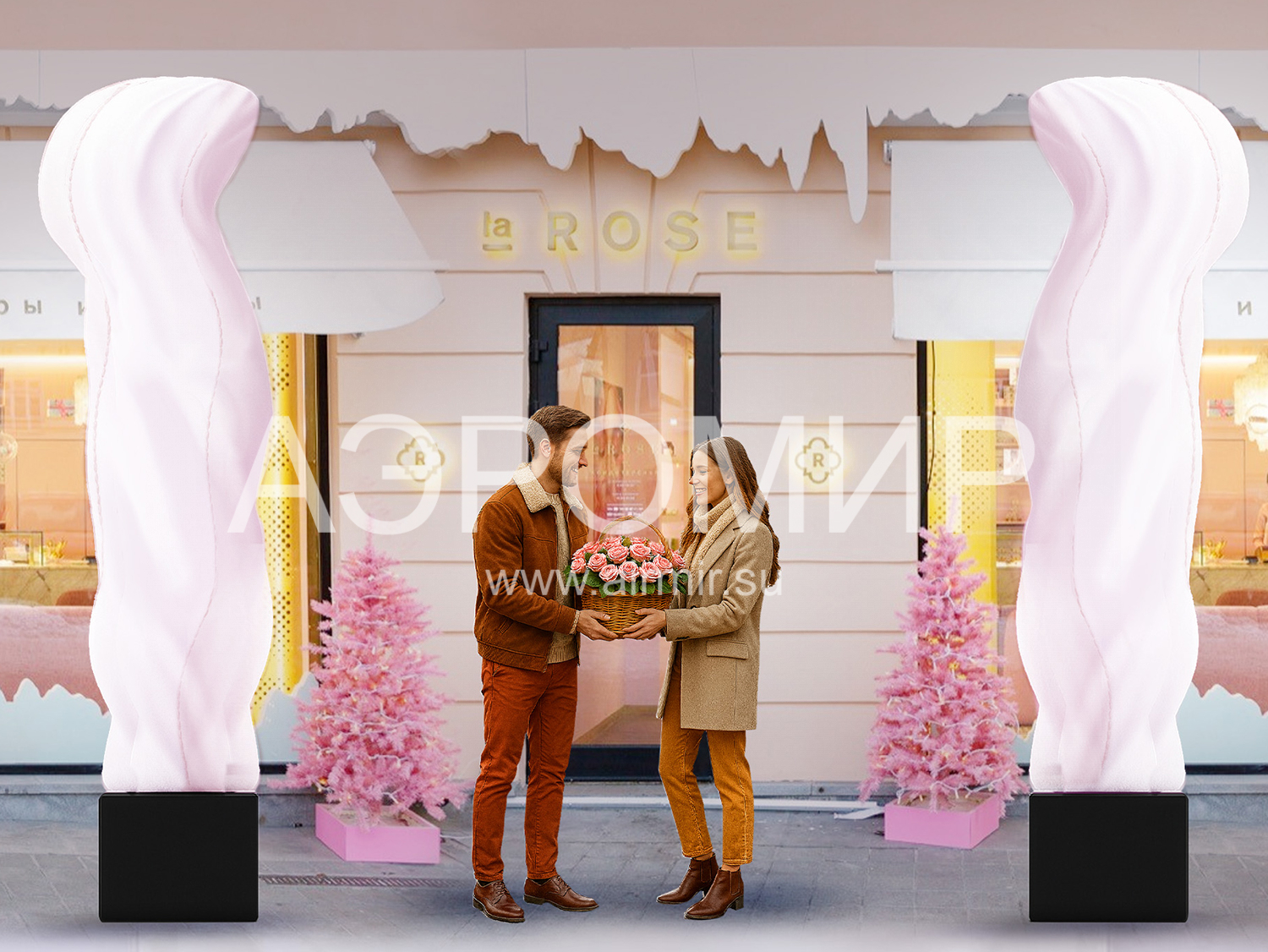 Аэрофонтан – это пример динамичного, а значит нескучного оформления праздничной площадки. Если Вы не представляете, что это такое, вспомните любой из увиденных когда-либо фонтанов. Как известно, он образуется, когда вода встречается с препятствием и из-за давления, создаваемого искусственно или естественно, устремляется вверх. Если заменить воду воздухом и ограничить его поток «трубой» из синтетической ткани, получится фонтан воздушный. Благодаря тому, что используемый материал, как правило, имеет очень гладкую, блестящую поверхность, на струящейся оболочке возникают переливы и блики, как на воде. Этот эффект заметно усиливается в вечернее время, когда можно включить встроенную подсветку.