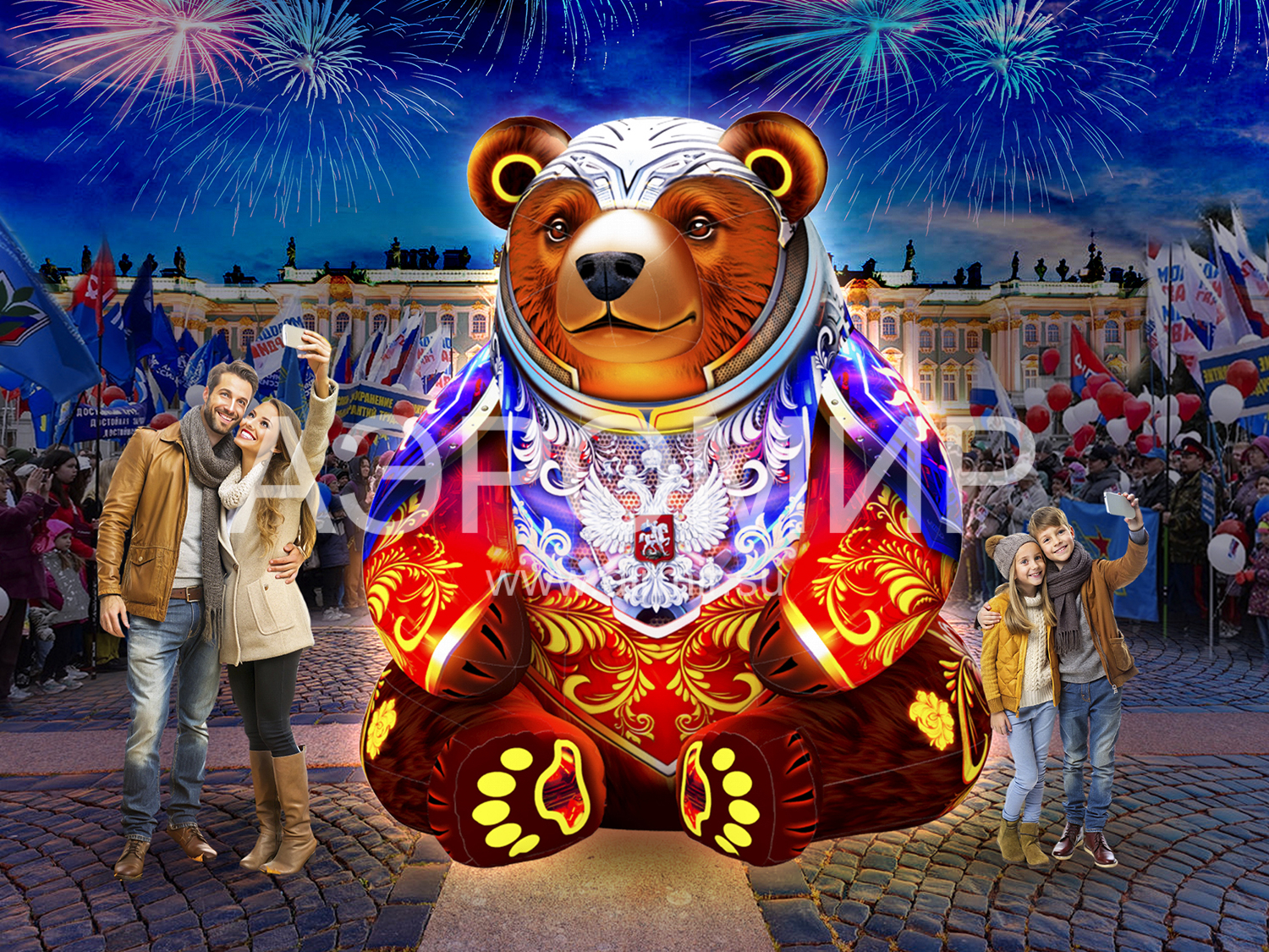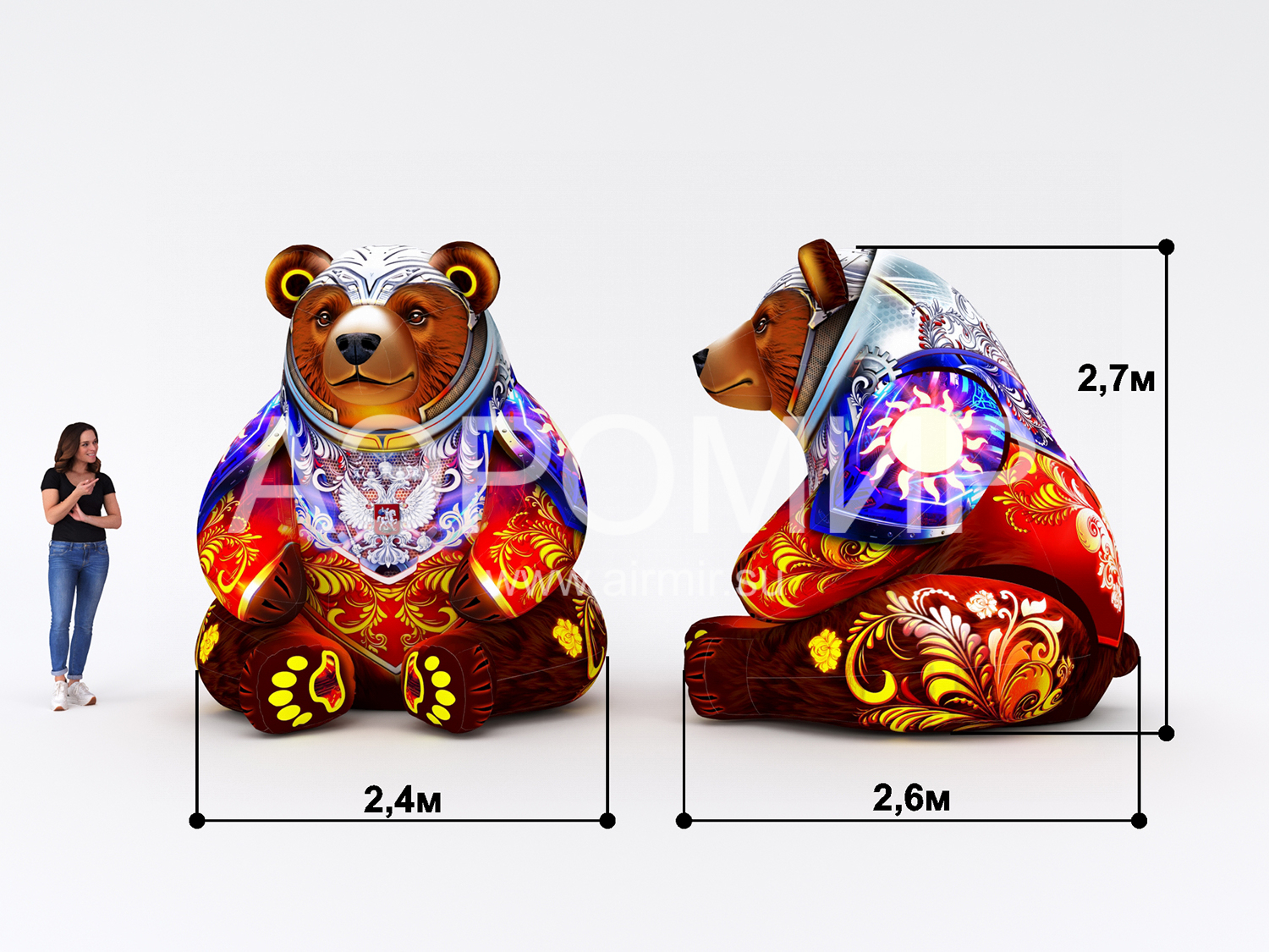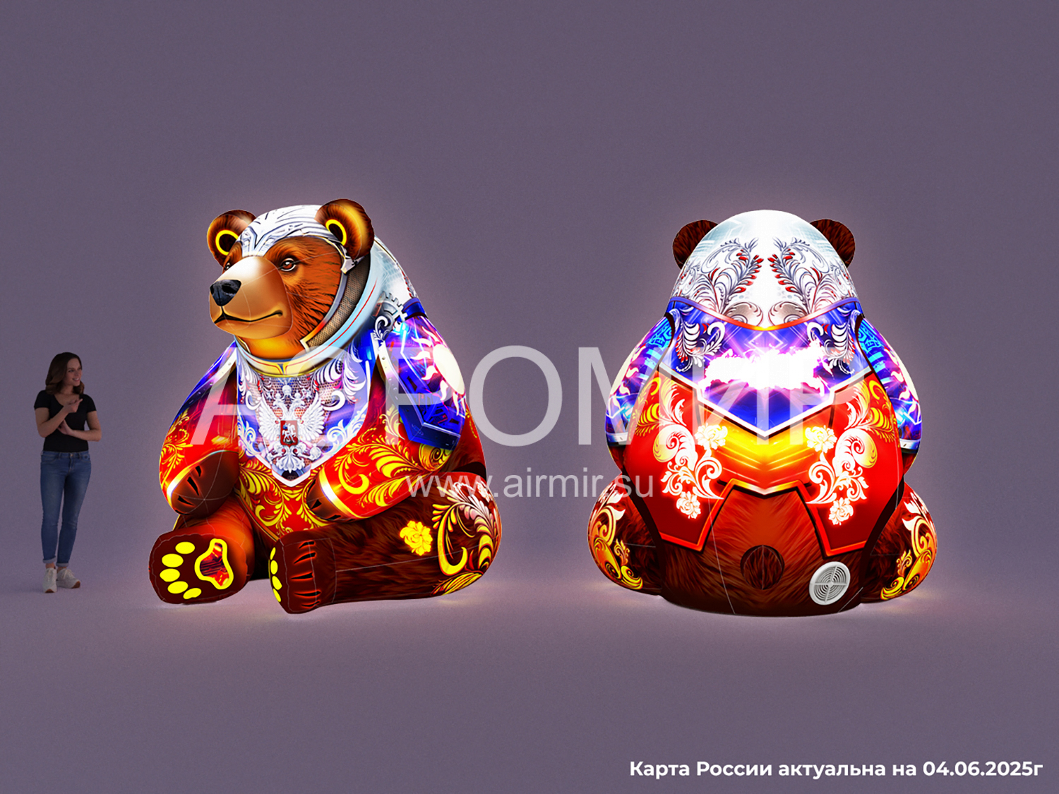 Надувной медведь в стилизованных доспехах – эффектная декорация с подсветкой для фотозон и мероприятий. Символизирует силу и русский дух. Возможна индивидуальная фотопечать.