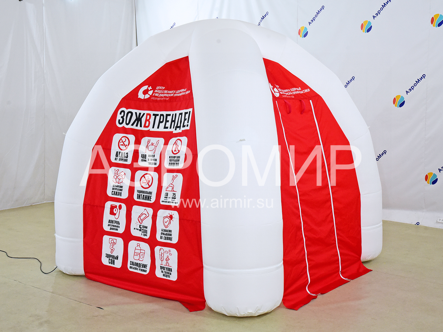 Четырехопорное сооружение. Небольшая, удобная в установке, надувная палатка для различных целей, например, для организации мобильной торговой площадки, PR мероприятия. Масса возможностей для применения, легкая в эксплуатации и сборке, мобильная, помещается в сложенном виде в сумке переноске.