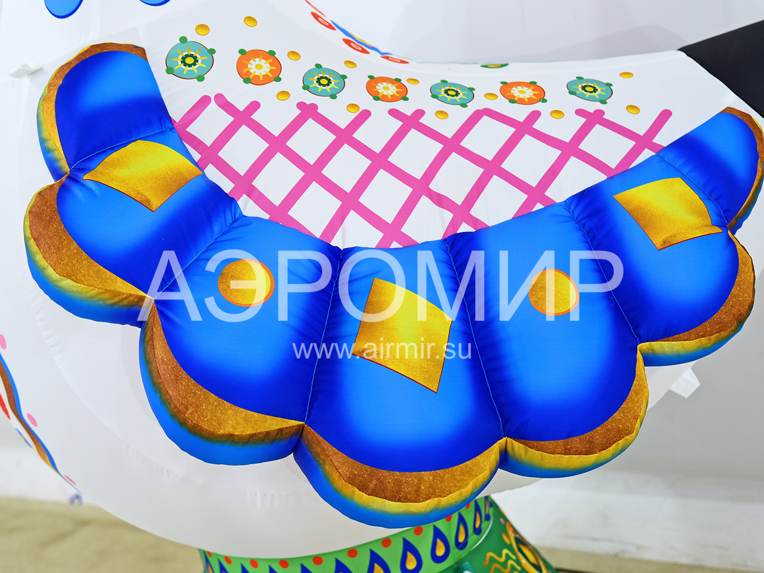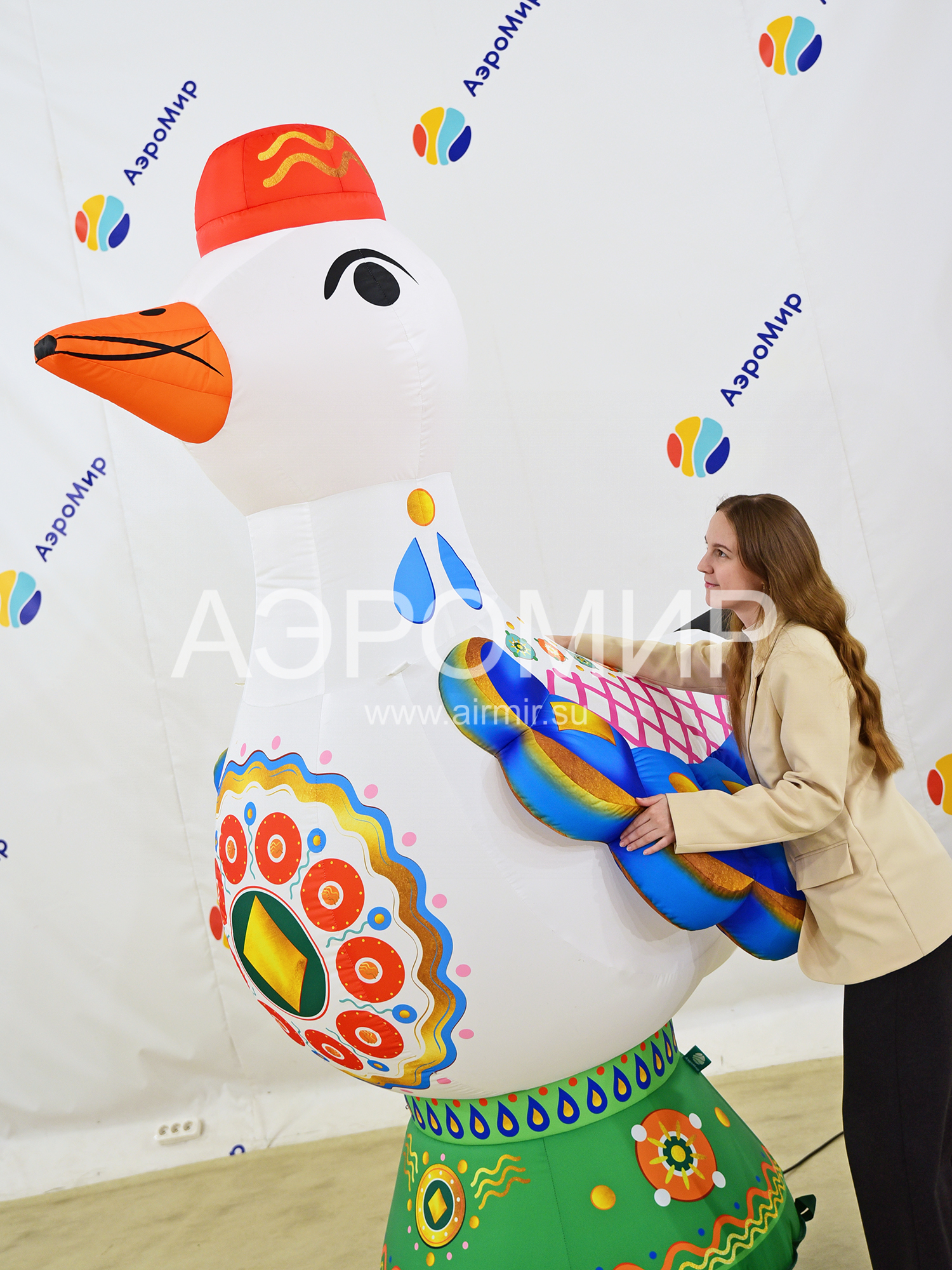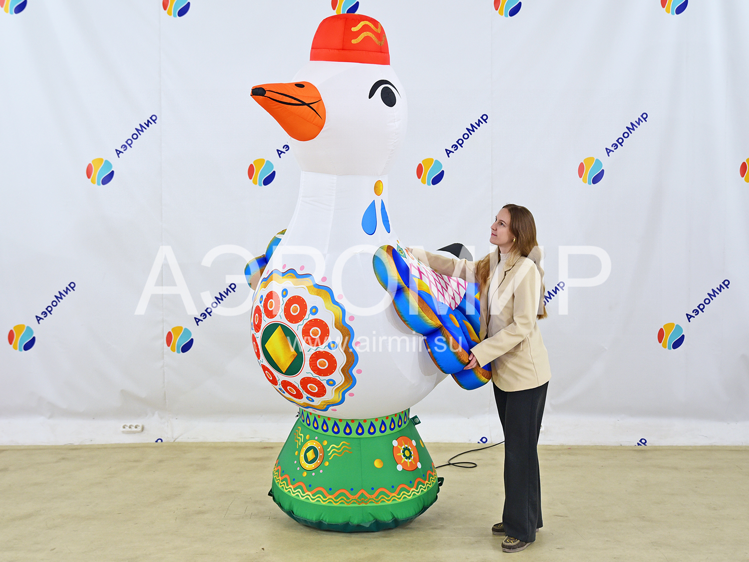 Эта очаровательная надувная уточка, выполненная в духе традиционных дымковских игрушек, станет эффектным украшением любого мероприятия. Она способна мгновенно привлечь внимание, обозначив вход на праздник или ярмарку, и привнесет праздничное настроение в интерьер дома культуры, театра, музея, библиотеки, ресторана или кафе. Благодаря своим внушительным размерам, эта заметная декорация идеально подходит для оформления городских улиц и просторных помещений, особенно во время Масленицы. Для еще большей функциональности, фигуру можно оснастить подсветкой и использовать для размещения рекламных сообщений.